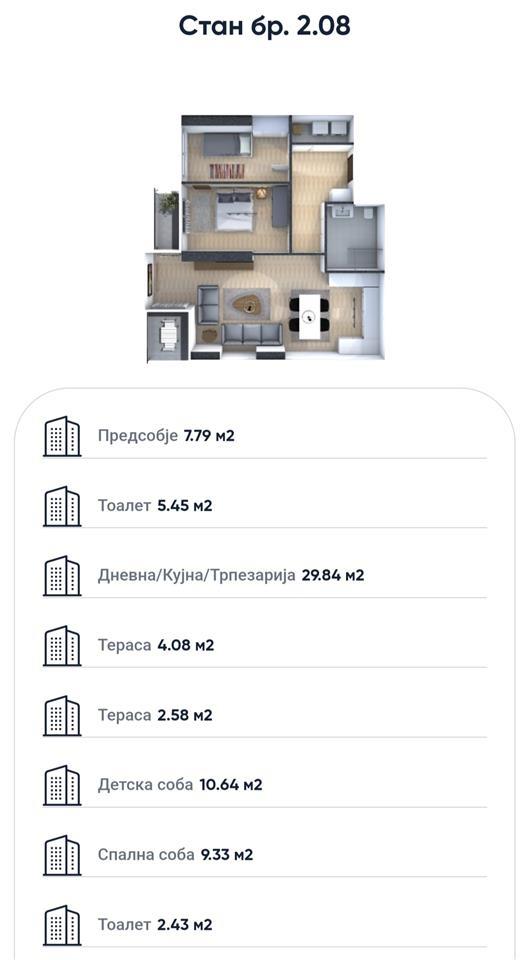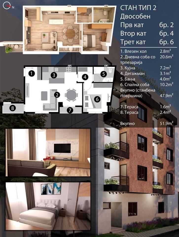 Naskoro pristigaat novi stanovi vo mala zgrada na odlichna i mirna lokacija vo Gjorche Petrov vo neposredna blizina na ООУ „Mirche Acev“ - Skopje na ulica 4-ti juli (boris sarafof) br.107b, so toa shto zgradata se sostoi od P+2+PO (prizemje + dva kata + potkrovje) so sekoj stan e obezbeden eden parking prostor, i stanovite se so slednite kvadraturi: 👉51 m2 - vlezen hol / Dnevna so terpezarija / kujna / spalna soba / banja / terasa - vtor kat 👉61 m2 - Vlezen hol / dnevna so terpezarija / kujna / degazhman / spalna soba / detska soba / banja / terasa - vtor kat 👉113m2 - Vlezen hol / degazhman / terpezarija / kujna / dnevna soba / spalna soba / detska soba 3x / toalet / banja / terasa / balkon - prv kat 👉118m2 - Vlezen hol / dnevna so terpezarija / kujna / detska soba / spalna soba / toalet / banja / terasa / terasa - Potkrovje Za povekje informacii javete se na 070227922 ili 070357899. објавено од Корисник: farha Dooel Телефон/и за контакт: 070227922