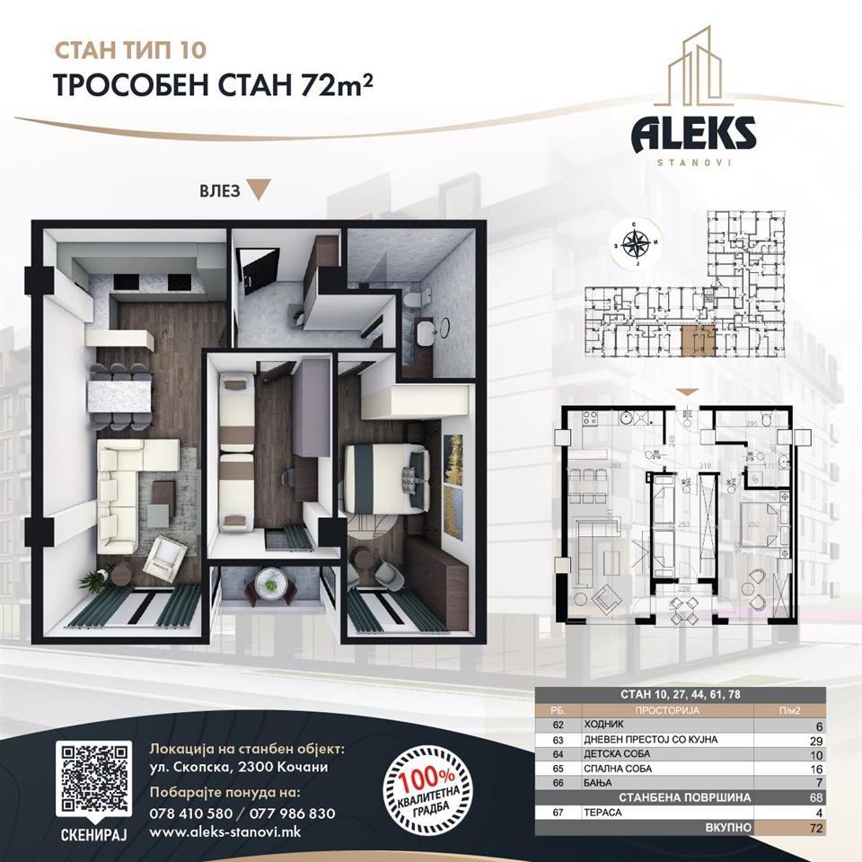 Нашиот нов објект Алекс “Premium Residence 05”Кочани, се наоѓа на атрактивнo - неповторлива локација во градот 🏡✨ Во близина на самиот објект, се наоѓа сè што Ви е потребно за комфорен живот: ✅ Детски парк; ✅ Најголемиот супермаркет во градот; ✅ Детска градинка; ✅ Фитнес центар; ✅ Слободни паркинг места околу станбениот објект. За повеќе информации, контактирајте нè на: ☎️ +389 (0) 78 410 580 ☎️ +389 (0) 77 986 830 🌐 https://aleks-stanovi.mk/ објавено од Корисник: Aleks stanovi Телефон/и за контакт: 078410596077986830