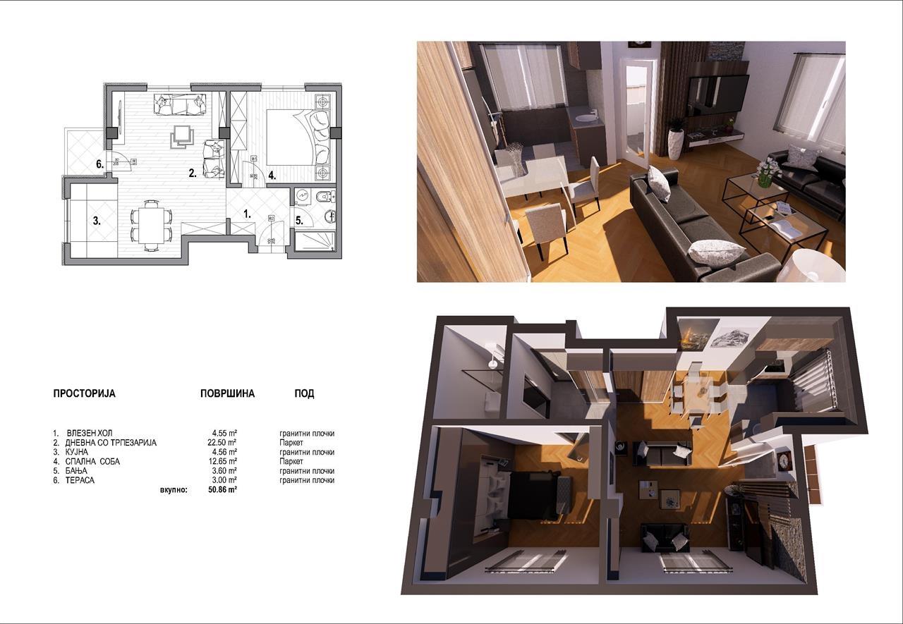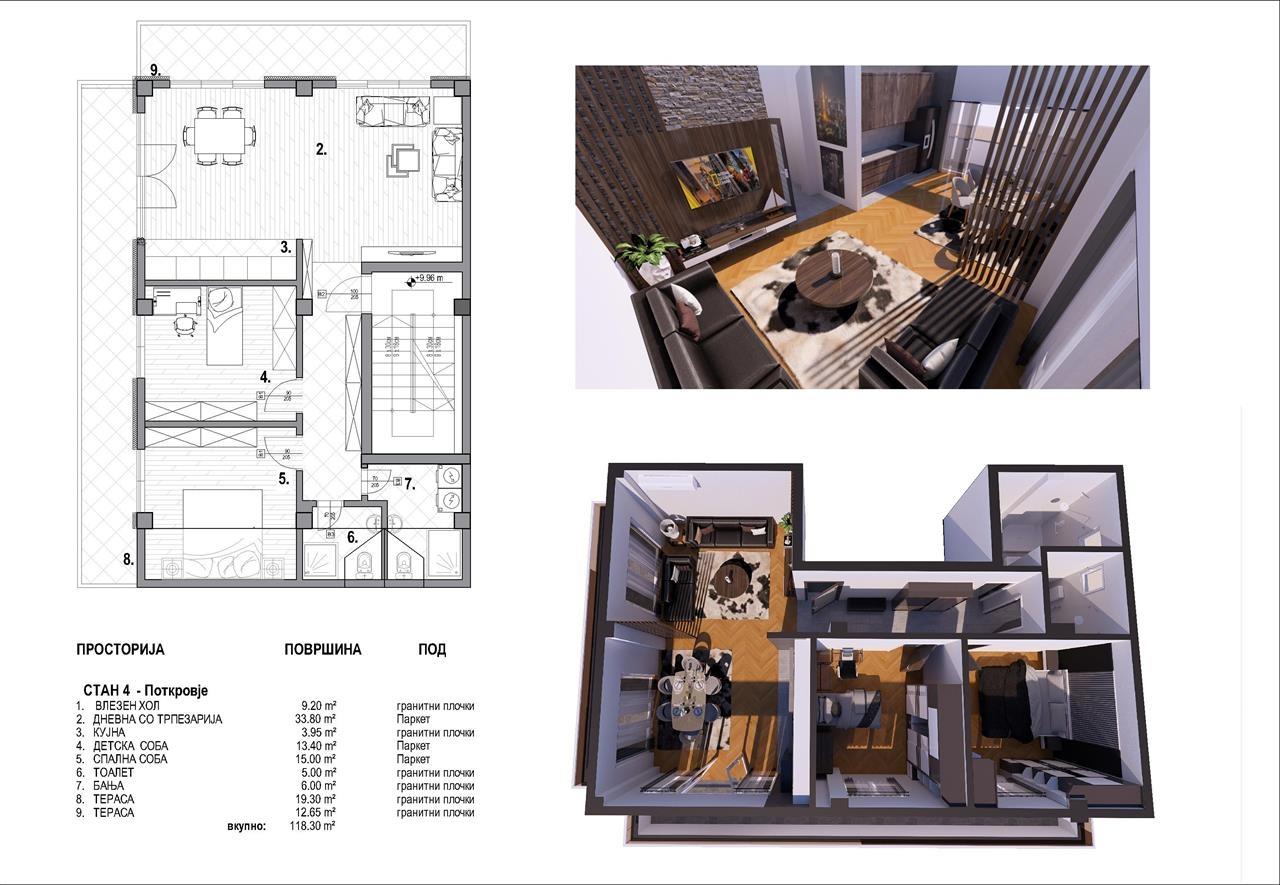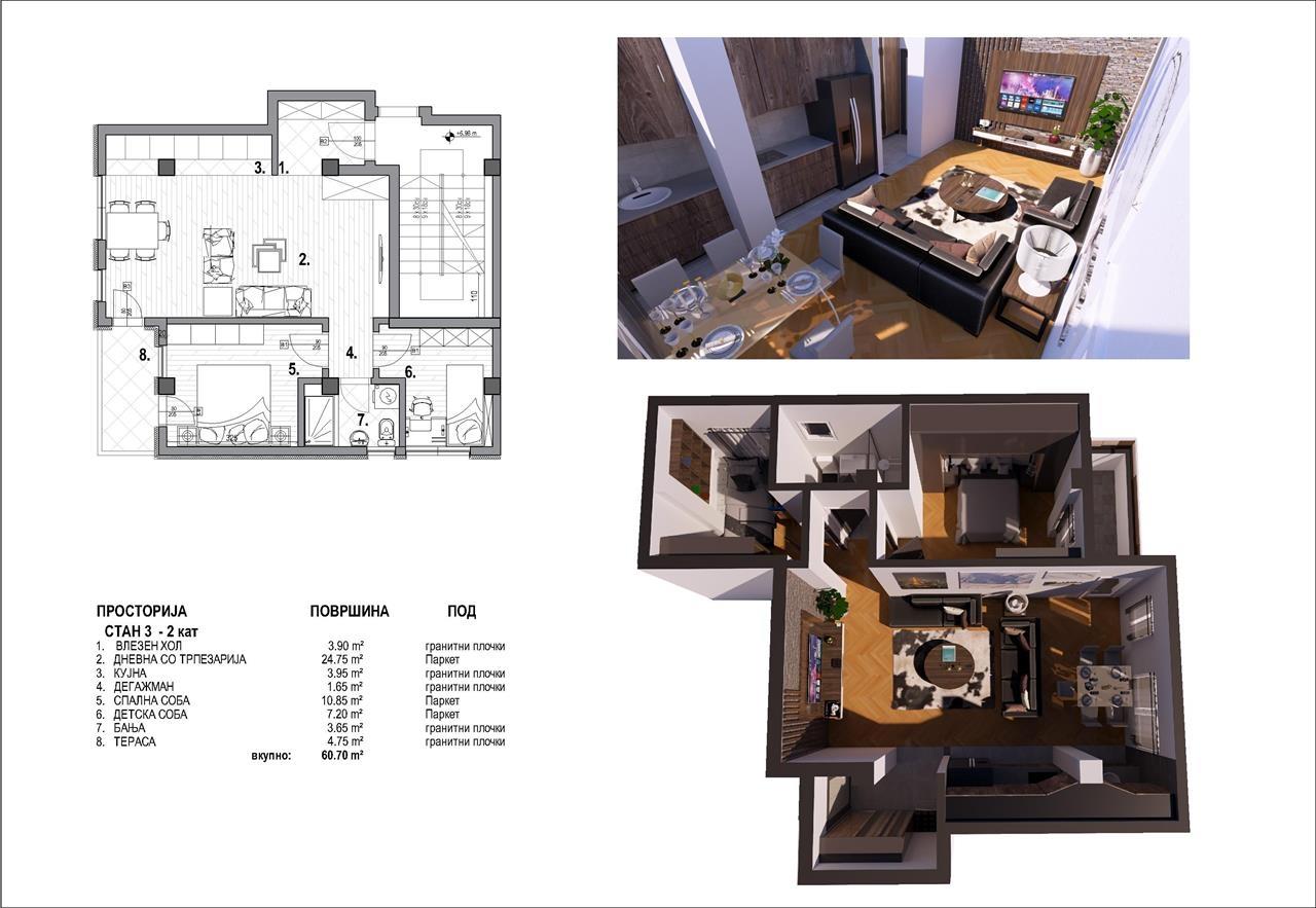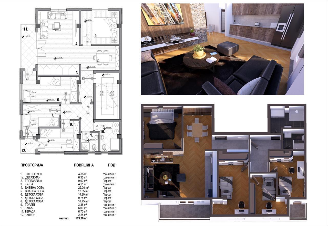 Naskoro pristigaat novi stanovi vo mala zgrada na odlichna i mirna lokacija vo Gjorche Petrov vo neposredna blizina na ООУ „Mirche Acev“ - Skopje na ulica 4-ti juli (boris sarafof) br.107b, so toa shto zgradata se sostoi od P+2+PO (prizemje + dva kata + potkrovje) so sekoj stan e obezbeden eden parking prostor, i stanovite se so slednite kvadraturi: 👉51 m2 - vlezen hol / Dnevna so terpezarija / kujna / spalna soba / banja / terasa - vtor kat 👉61 m2 - Vlezen hol / dnevna so terpezarija / kujna / degazhman / spalna soba / detska soba / banja / terasa - vtor kat 👉113m2 - Vlezen hol / degazhman / terpezarija / kujna / dnevna soba / spalna soba / detska soba 3x / toalet / banja / terasa / balkon - prv kat 👉118m2 - Vlezen hol / dnevna so terpezarija / kujna / detska soba / spalna soba / toalet / banja / terasa / terasa - Potkrovje Za povekje informacii javete se na 070227922 ili 070357899. објавено од Корисник: farha Dooel Телефон/и за контакт: 070227922